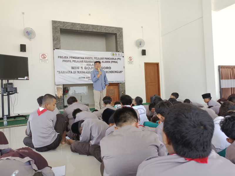 Bojonegoro, 24 Agustus 2024 - Peserta didik Kelas VI MIN 1 Bojonegoro hari ini mengikuti Program P5RA (Pendidikan Penguatan Profil Pelajar Rahmatan Lil 'Alamin) dengan tema "Bahagia di Madrasah Tanpa Perundungan". Acara yang diadakan pada Sabtu, 24 Agustus 2024 ini menghadirkan psikolog, Agus Ari Afandi, sebagai pembicara utama.